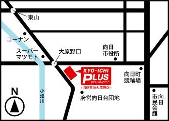 - 向日町競輪場 隣り・大原野口交差点南側 (阪急 東向日駅より向日市役所に向かって徒歩約15分)