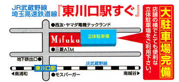 - 東川口駅徒歩1分 大型立体駐車場完備 (駐車券をお持ちになりご来店下さい カウンターで無料処理致します)