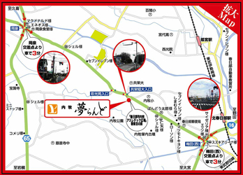 - 国道16号線(梅田西)交差点を(岡泉)方面へと向かい、共栄短大入口交差点左手付近、内牧公園そばです