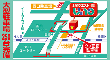 - JR上尾駅西口を右側に降りてすぐ(看板が目印です)