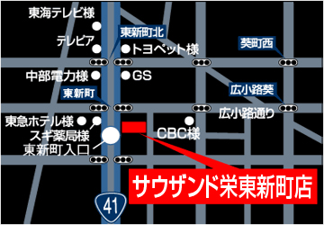 - 地下鉄「新栄町駅」から徒歩8分 地下鉄「栄駅」から徒歩10分 名古屋高速『東新町入り口』すぐ横 【店舗地図】マップコード【4 290 785*01】