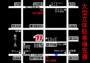 - 国道一号線中島新町3丁目西交差点を北へ直進すると左手に店舗があります 【店舗地図】