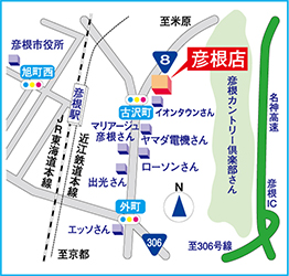- 白い看板が目印!名神彦根インターからは国道8号線外町交差点を米原方面へ右折300M、米原方面からは佐和山トンネルを越えて50M