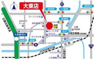 - JR学研都市線 住道駅より徒歩20分 近畿自動車道 大東鶴見IC降りて10分