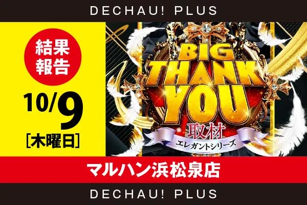 BIG THANK YOU取材はでちゃう!の取材イベントで、並び系/全台系の公約傾向があります。過去5回の開催データからAIが機種傾向を分析。マルハン吉原店、マルハン村松店等で多く開催されています。